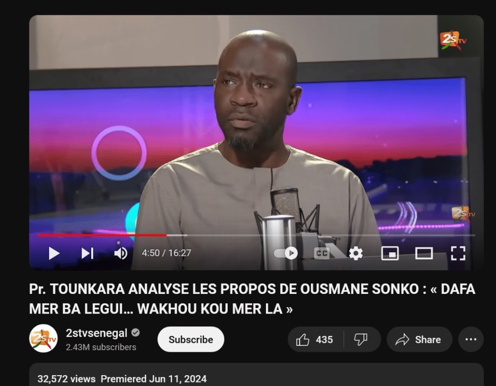 M. Tounkara, par ailleurs connu pour son rôle d’animateur d’une autre émission sur 2STV, réagissait à des propos tenus par Ousmane Sonko, actuel Premier ministre, lors d’une conférence politique donnée le 9 juin 2024 à Dakar.